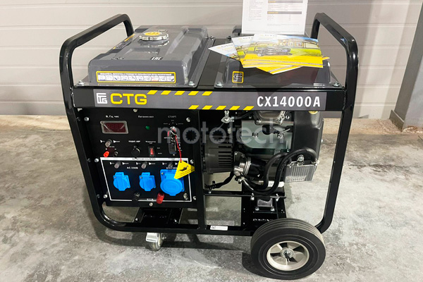 Однофазный портативный бензогенератор CTG CX14000A, резервной мощностью 11 кВА. Генератор оснащен электронной панелью с цифровым дисплеем. Тип запуска - ручной / электростартер. Объем топливного бака 23 л. В комплекте стальная опорная рама, тележечный комплект, наличие разъема для подключения внешнего ATS.